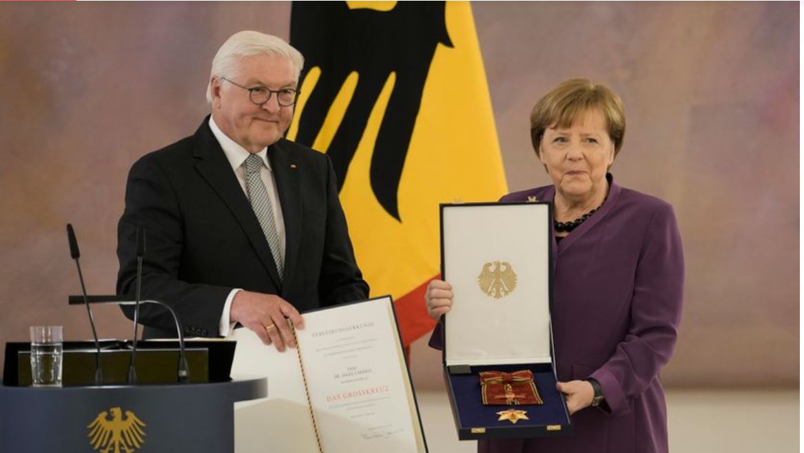Германскиот претседател Франк-Валтер Штајнмаер денеска ѝ додели на поранешната канцеларка Ангела Меркел голем крст за заслуги, највисоката награда што постои во Германија.