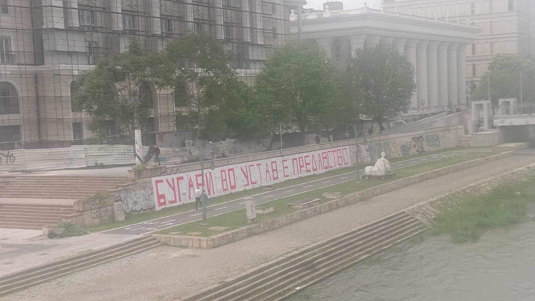 Пред неколку дни се вратив од странство во мојата мила татковина Македонија, и излегов да пешачам покрај кејот на Вардар. И веднаш до историскиот камен мост забележав еден натпис во ѕидот, над кое се издигнало зградата – симбол на српската окупаторска власт во вардарска македонија, така наречен ‘офицерски дом’! Натписот гласаше: ‘Бугарите во устав е предавство!!