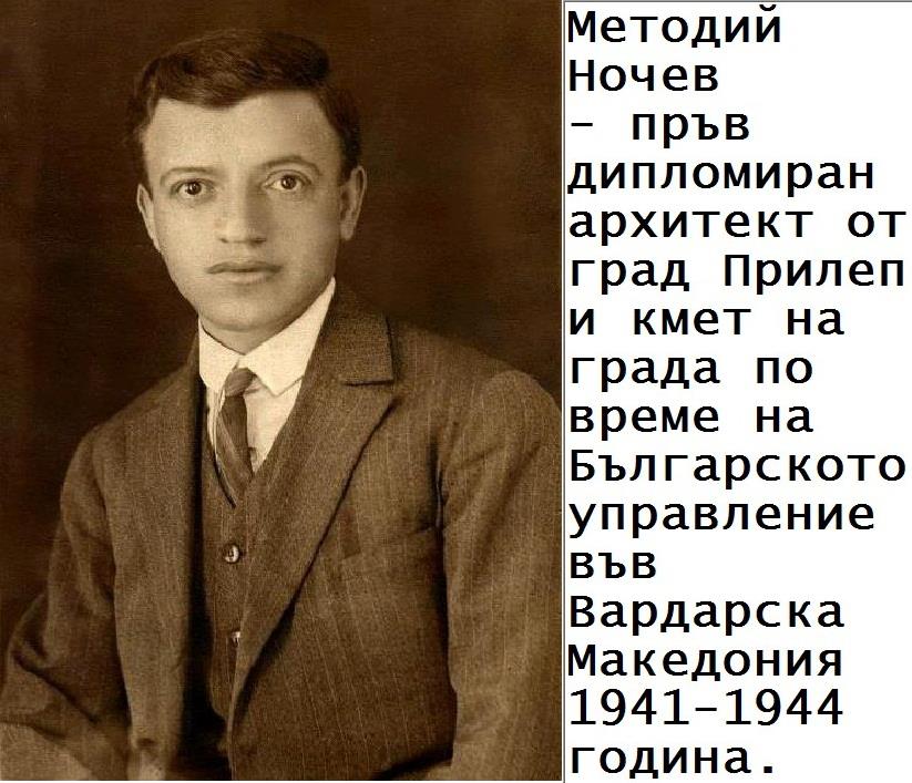 Методиј Ночев од Прилеп, Вардарска Македонија – градежен инженер, член на Македонската младинска тајна револуционерна организација во Кралството Југославија. За време на бугарското владеење во Македонија за време на Втората светска војна (1941 – 1944) бил градоначалник на родниот Прилеп.