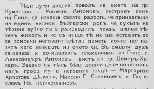 (…) Се сметаме себеси за исклучително среќни што ја имавме ретката чест да бидеме задолжени за тешката, но благородна задача да ја организираме општинската служба во мојот драг роден град Дебар, новоослободен од храбрата бугарска војска…“