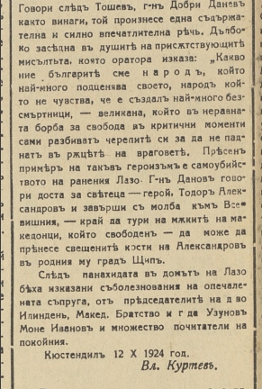 „После Тошев говор одржа г-н Добри Данев, како и секогаш, тој одржа еден впечатлив говор. Длабоко во душите на присутните заседна мислата што ја кажа говорникот: Како ние Бугарите сме народ, што најмногу го потценува своето. Ние сме народ, кој не чувствува дека создал најмногу бесмртни великани, народ кој во нерамна борба за слобода, во критични моменти, сами си ги разбиваат главите за да не паднат во рацете на непријателите. Песна пример за таков хероизам е самоубиството на ранетиот Лазо“