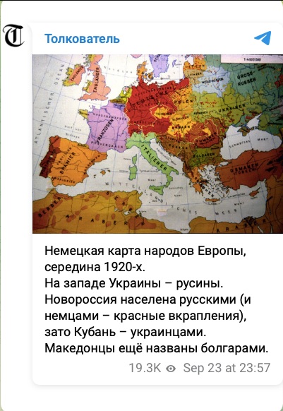 Германска мапа од 20-тите години на минатиот век, опишува каде живеат Русите и каде живеат Украинците. Автор во „Телеграм“ додава дека Македонците на картата сѐ уште се нарекуваат Бугари… Пишува во својот блог познатиот бугарски новинар и блогер Иво Инџев.