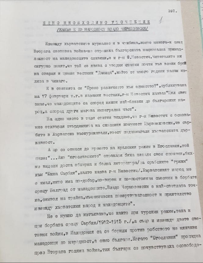 Значи, заради појаснување за луѓето од помладата хрватска генерација, морам да истакнам дека Черноземски останува симбол на трајното пријателство и маченичко пожртвувано пожртвувано меѓу хрватскиот народ и Бугарија; но во никој случај симбол на ниту една македонска националност, која Черноземски никаде во Македонија ја немаше сретнато, иако и тој долго време беше четник таму.