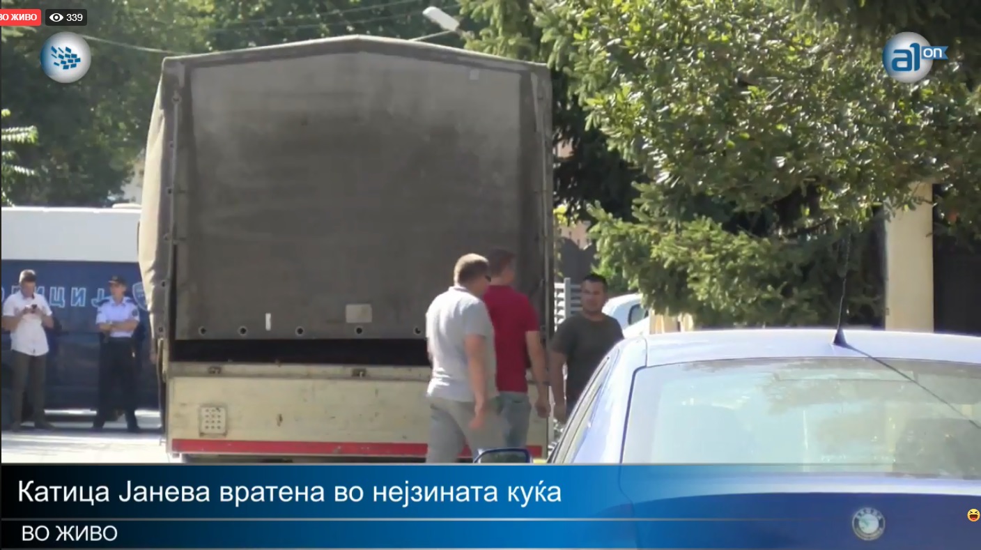Додека снимателите чекаат Катица Јанева да излезе од полициското комбе, на местото се појави камион и се паркира стратешки за да не може да се види како Јанева влегува во својата куќа.
