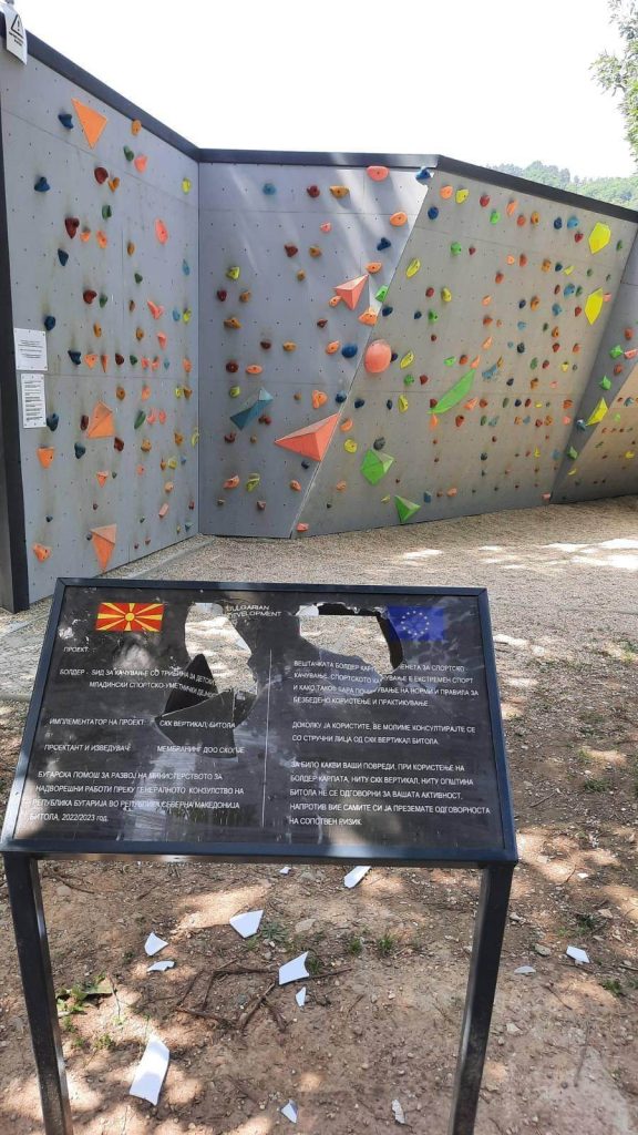 Потсетуваме дека свеченото отворање на ѕидот за качување, донација од Бугарија, се случи на 3 јуни во Градскиот парк во Битола. Една недела подоцна на 10 јуни со зелена самолеплива лента непознати сторители го покриле текстот за бугарскиот донатор, логото за помошта за развој а исто така и бугарското знаме.