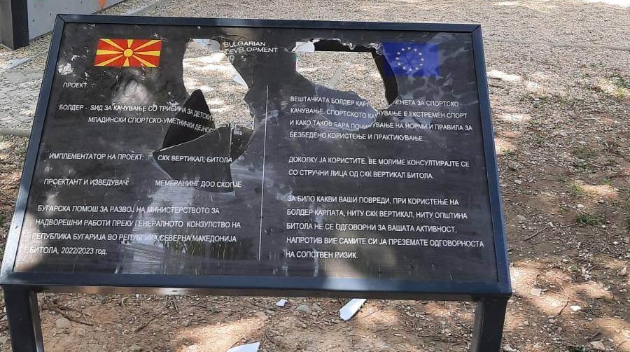 До порталот Трибуна стигна фотографија од наш читател на која јасно се гледа дека информативната табла поставена пред ѕидот за качување со штандови направен со финансиска помош на бугарското МНР и генералниот конзулат на Бугарија во Битола е искршена.