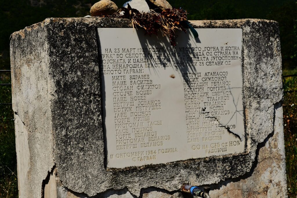 Гарван изгледа напуштено, но сепак има некаков живот. Повеќето куќи се полусрушени, очигледно е дека стопаните наполно се откажале од евентуален живот тука, но има барем пет-шест куќи во кои се гледа живот. Веројатно сите не живеат тука преку годината, но сега е лето, па има и неколку деца низ дворовите. На излезот од селото има споменик, висок околу два метра, со чешма од подножјето во која има вода. Споменикот е подигнат во 1984 година, во спомен на убиените жители од Гарван, а споменикот го подига…нема да се сетите, Сојузот на борците од НОБ од Радовиш. На врвот на споменикот има ѕвезда петокрака, но напишано е коректно-убиени од југословенската власт во 1923 година. Ставен е и датумот 23 март, што не соодветствува со информацијата на разузнавачката служба на ВМРО. Горе на споменикот има оставено цвеќе, сега веќе наполно исушено…добро е тоа, жртвите не се заборавени, некој доаѓа и оддава чест.