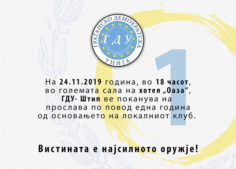 „Почитувани сограѓани, пријатели, членови и симпатизери на Граѓанско Демократската Унија- ГДУ, на 24-ти ноември 2019 година, во 18 часот, во големата сала на хотел „Оаза“ ве покануваме на прослава по повод една година од отворањето на локалниот клуб во Штип. Поканата е отворена за секој од вас, повелете ќе ни биде чест заедно да го одбележиме овој наш мал јубилеј!