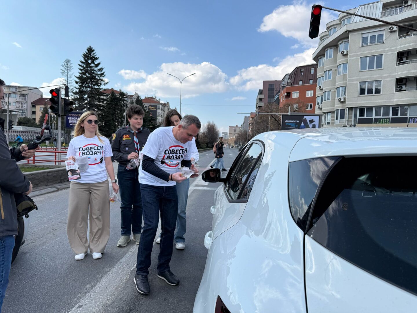 На возачите кои застануваа на семафорите им беа давани флаери и промотивен материјал со пораки за безбедно возење и со информации за јавниот повик за субвенции што е во тек.