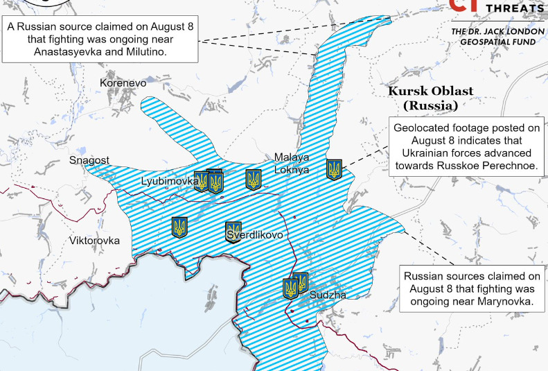 Geolocated footage and Russian claims indicate that Ukrainian forces continued rapid advances further into Kursk Oblast on August 8, and Ukrainian forces are reportedly present in areas as far as 35 kilometers from the international border with Sumy… https://t.co/9dC8Fg0eDe pic.twitter.com/krehj0KL6c