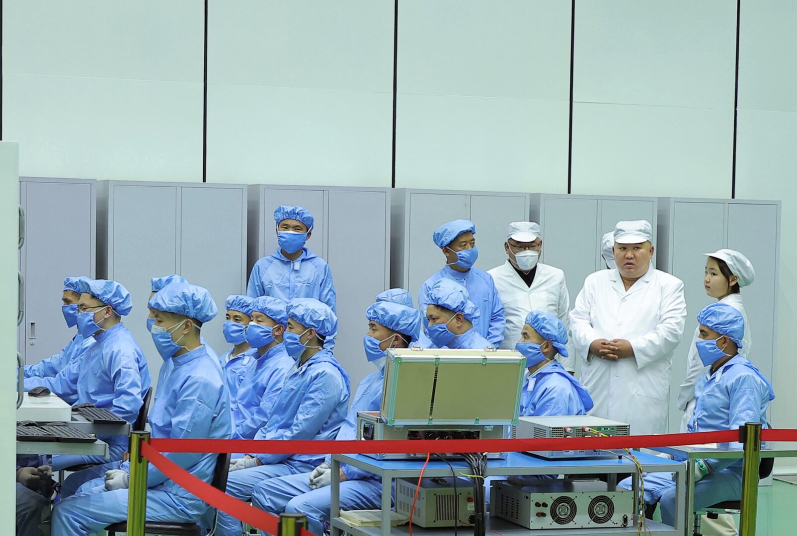 Фотографиите објавени од весникот „Родонг Синмун“ во вторникот покажуваат дека Ким и неговата ќерка, облечени во бели лабораториски мантили, разговараат со научниците во близина на она што се чини дека е главна сателитска компонента.