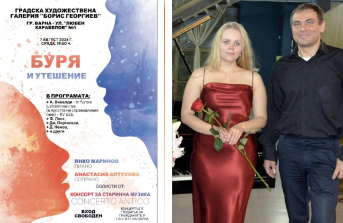 Подарък за варненската публика ще бъдеконцертът на пианиста Янко Маринов и сопраното Анастасия Алтухова в Градската художествена галерия “Борис Георгиев” на Варна на 7 август от 19:00 ч. Двамата са солисти на консорта на старинна музика “Concerto Antico” и са подготвили за меломаните в морския град програма под мотото “Буря и утешение”. В нея са включени виртуозният мотет за сопрано от Антонио Вивалди “In furore iustissimae irae” (В яростта на справедливия гняв) RV 626, както и някои от най-драматичните, но и философски произведения на Ференц Лист – “В гнева”, “Бурята”, “Утешения”, “Funérailles” (октомври 1849) S.173/7 из „Поетични и религиозни хармонии“ Harmonies poétiques et religieuses III, S.173, унгарски рапсодии, рядко изпълняваната кантата “Salve Regina” от Джовани Батиста Перголези и “Ave Maria” от Пиетро Маскани. Ще чуем и песен на българския композитор Димитър Ненов от цикъла “Вечната и святата” по стихове на Елисавета Багряна.