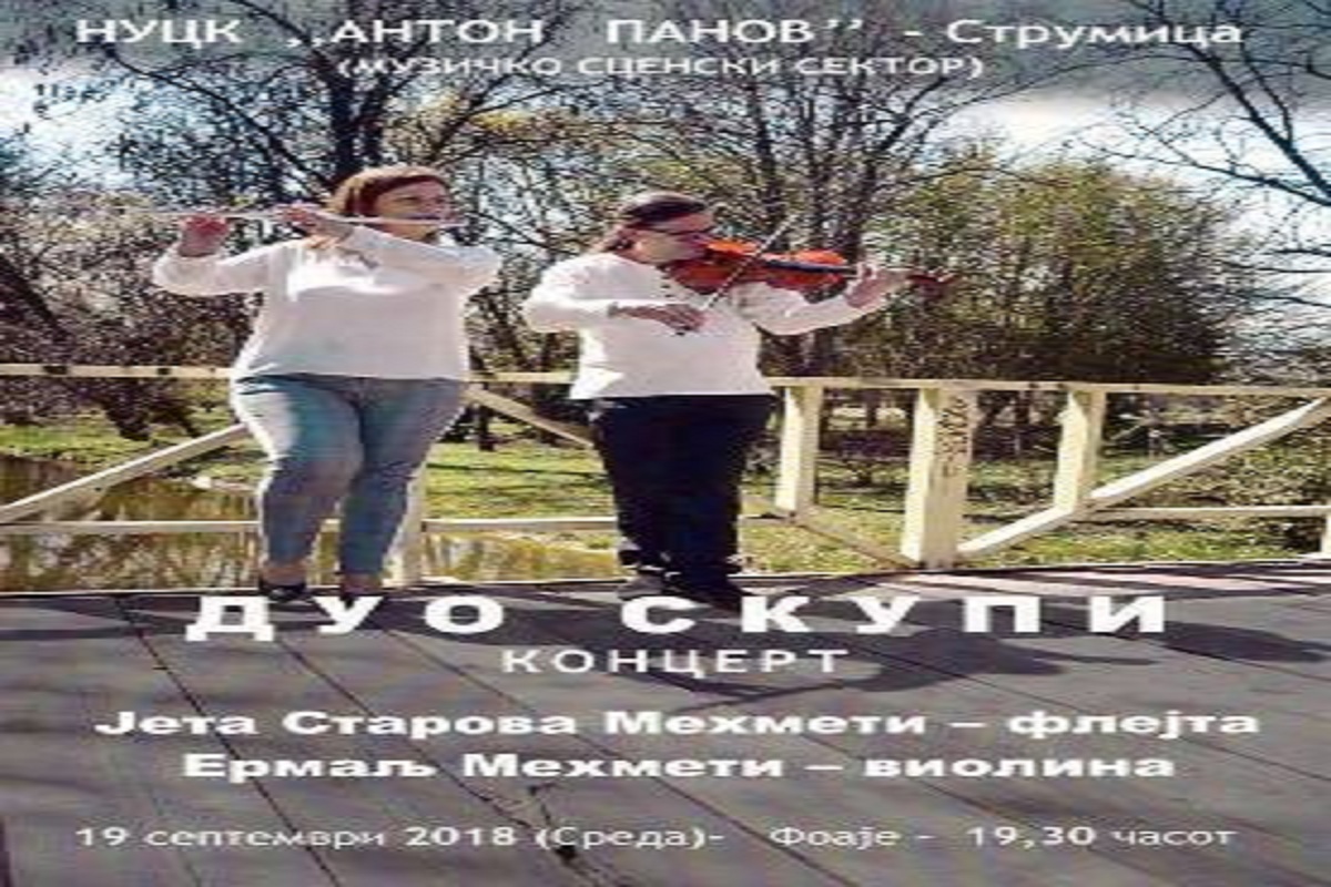 Во Центарот за култура „Антон Панов“ во Струмица денеска (19 септември) со почеток во 19:30 часот концерт ќе одржи „Дуо Скупи“ составено од Јета Старова-Мехмети (флејта) и Ермаљ Мехмети (виолина) …