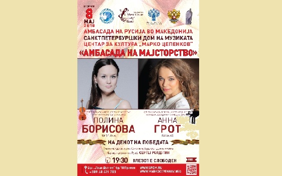 Во рамки на концертот, кој се реализира во соработка со Амбасадата на Руската Федерација во Република Македонија и Санктпетербуршкиот дом на музиката, ќе настапат лауреатите на меѓународни натпревари: Ана Грот на пијано и Полина Борисова на виолина. Грот и Борисова ќе изведат дела од Бела Барток, Антонин Дворжак, Фриц Крејслер, Секеј, Брамс, Рјабцев, Скорик, Рахманинов, Шопен и Албенис.