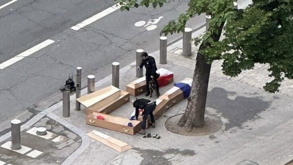 Полицијата уапси три лица откако беа пронајдени пет ковчези во близина на Ајфеловата кула во Париз, обложени со француски знамиња со натпис „Француски војници во Украина“, пренесува „АФП“.