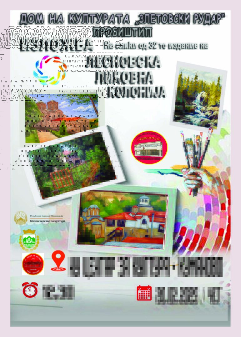 На 20 февруари, четврток, со почеток во 12,30 часот во Изложбениот салон на НУ Центар за култура „Трајко Прокопиев“ – Куманово ќе биде отворена 32-та Меѓународната Лесновска ликовна колонија. Изложбата содржи триесеттина дела работени во повеќе ликовни техники.