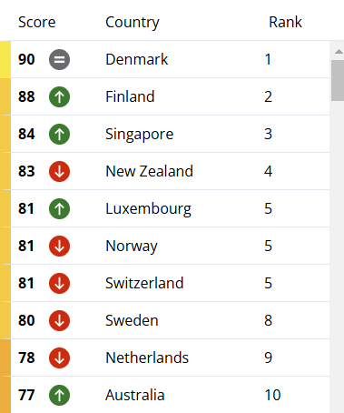 Највисоко рангирана и годинава останува Данска со 90 индексни поени, по што следат Финска со 88, Сингапур со 84 поени, Нов Зеланд со 83 и Луксембург со 81 поен.