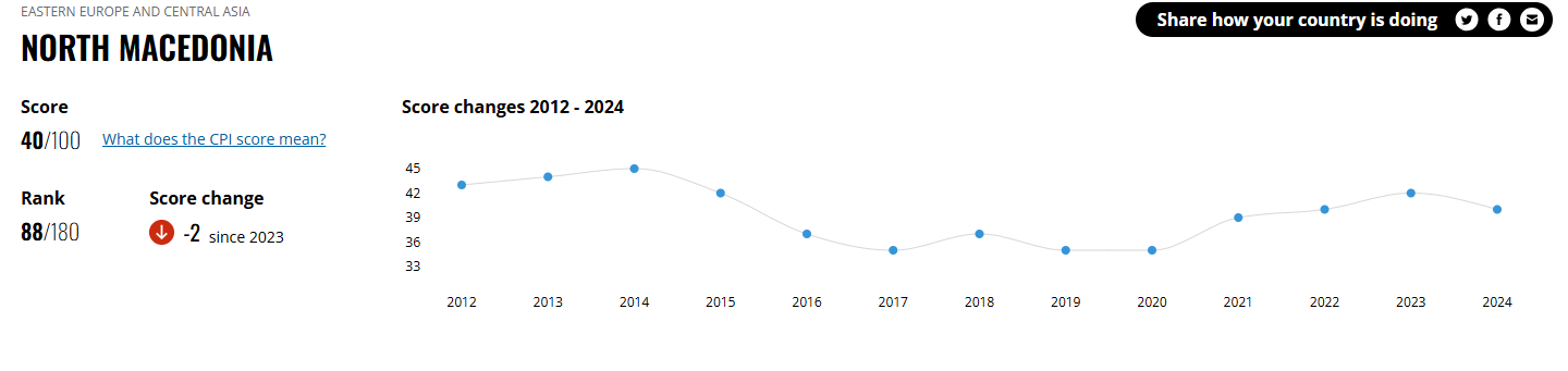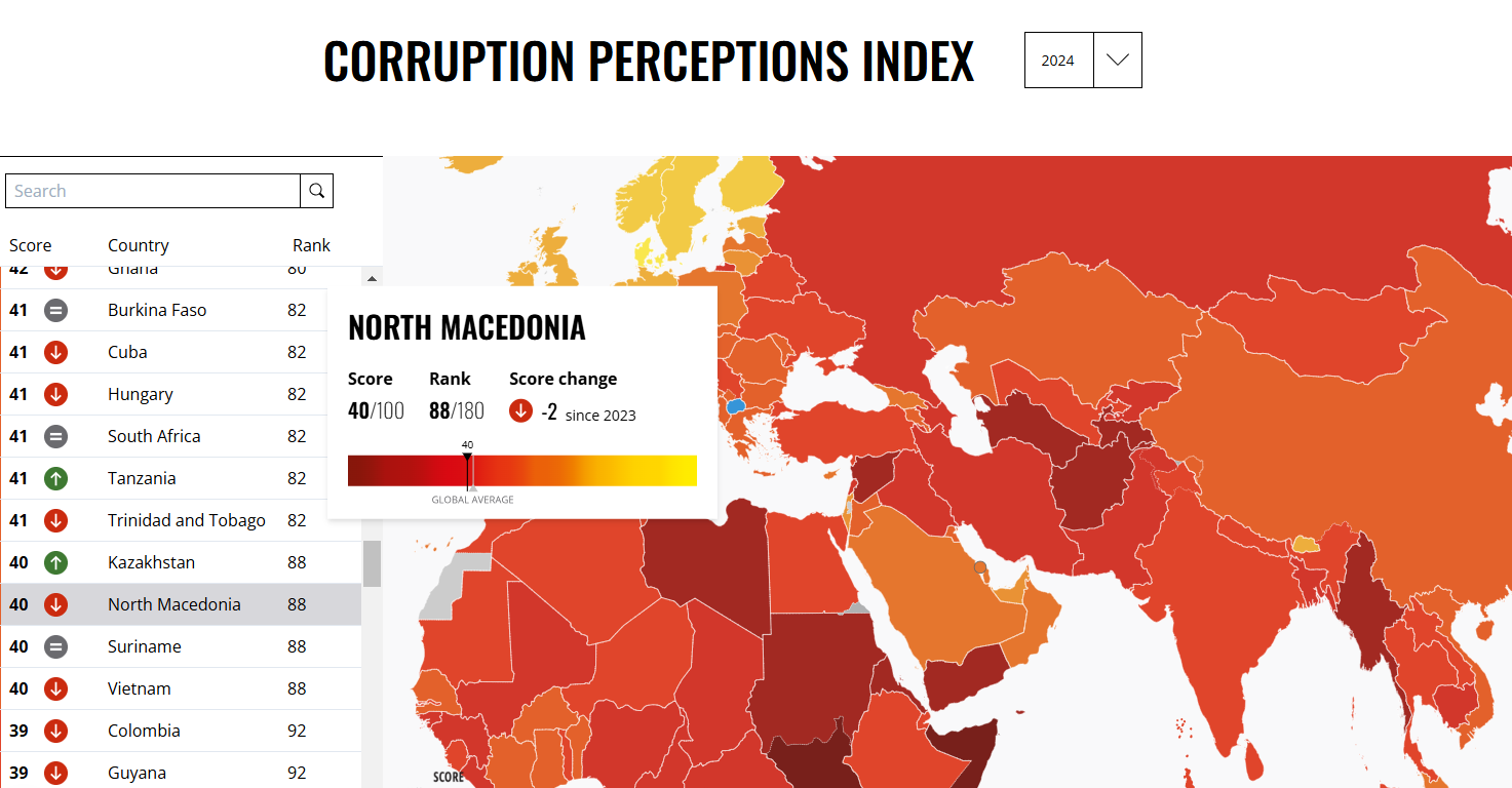 Индексот на перцепција на корупцијата на Транспаренси Интернешнл за 2024 година покажува пад од два индексни поени на земјава во однос на минатата, рангирајќи ја на 88 позиција заедно со Казахстан, Суринам и Виетнам.