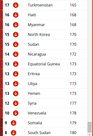 На последно место е Јужен Судан со 8 индексни поени, додека пред него се Сомалија со 9 и Венецуела со 10 индексни поени.