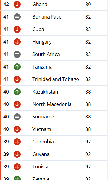 Србија е на 105 позиција, а Хрватска има пад од 3 поени и е на 63 позиција.
