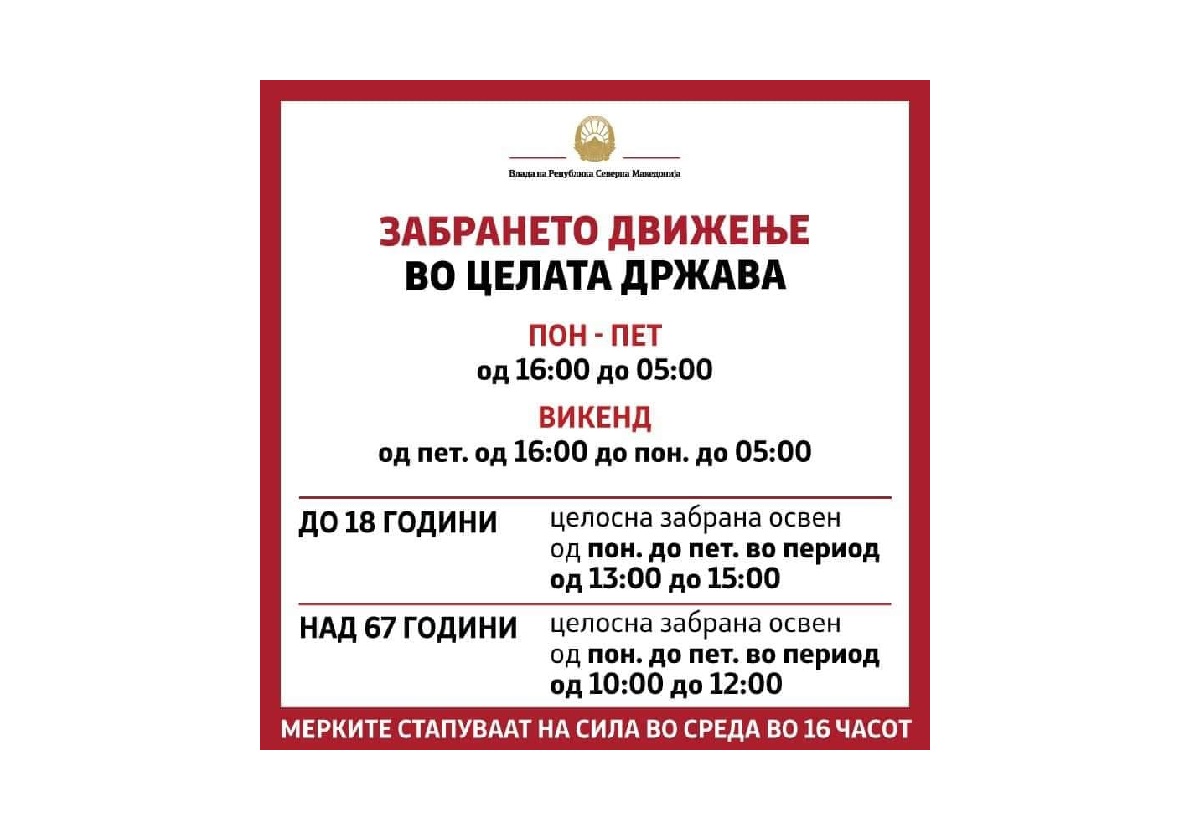 МЛАДИТЕ ДО 18 ГОДИНИ МОЖАТ ДА СЕ ДВИЖАТ ОД ПОНЕДЕЛНИК ДО ПЕТОК ОД 13 ДО 15, ДОДЕКА СТАРИТЕ НАД 67 ОД 10 ДО 12 ЧАСОТ