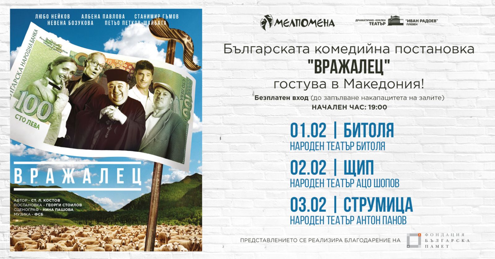 Една од најпопуларните бугарски театарски комедии „Вражалец“ на театарската формација „Мелпомена“ во првите денови од февруари ќе ги насмее жителите на три града во Република Северна Македонија. Претставите ќе се одржат со поддршка на Министерството за надворешни работи на Република Бугарија и Фондацијата „Бугарска памет“ во лицето на д-р Милен Врабевски. Влезот за претставите ќе биде бесплатен до пополнување на слободните места во салите.