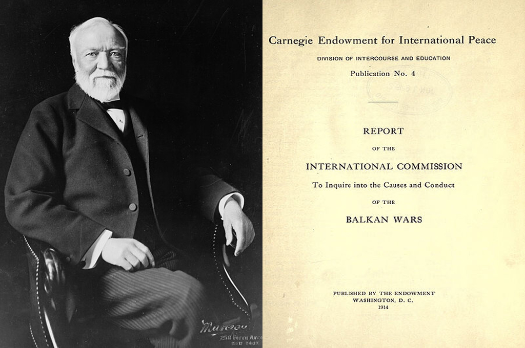 Во 1848 г. емигрира во Америка и се населува во Пенсилванија. Од 1890 г. е начело на американската челична индустрија. Негово верување е дека богатите имат морален долг да бидат големи филантропи. Е. Карнеги е еден од најбогатите луѓе на своето време и вложува над 350 милиони долари во благотворителни иницијативи, кое што при современите услови е над 10 милиарди долари. Во Питсбург создава Техничко училиште „Карнеги“ кое се раширува и претвора во универзитет „Карнеги Мелон“. Покасно вложува уште 10 милиони долари за научни цели. Изградил стотици обштествени библиотеки, како и неколку големи научноистражувачки центри и фондации. Дарува немала сума за изградба на концертната сала во Њу Јорк, именувана во негова чест „Карнеги Хол“. Во 1910 г. Карнеги дава 10 милиони долари за создавање на фондација за мир: Carnegie Endowment for International Peace. Неговата фондација го спонзорира спровдувањето на познатата Карнегиева анкета после Меѓусојузничката војна во 1913 г. Тој учествува со 1,5 милиони долари за изградба на Дворецот на мирот во Хаг, каде што се наоѓа Меѓународниот суд на ООН.