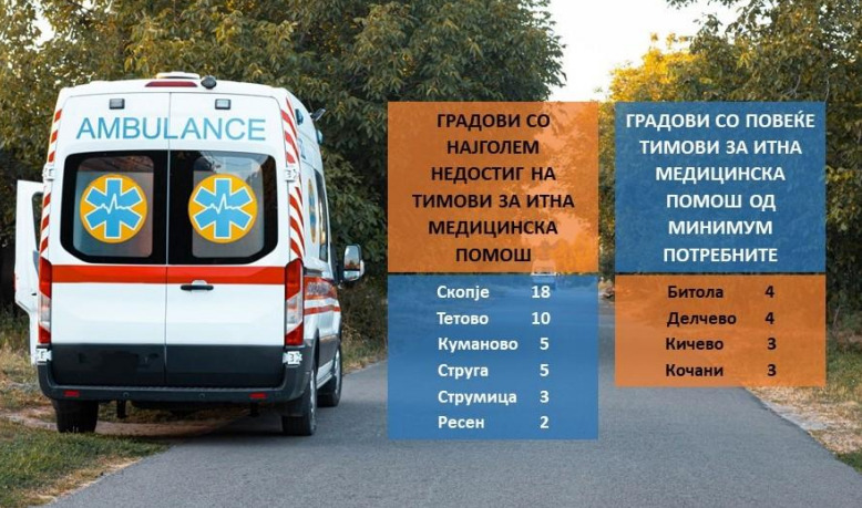 „Најмногу тимови, 18 недостигаат во Скопје, додека Битола има 4 повеќе од минимум потребните. Дури половина од 33-те здравствени центри имаат помалку тимови од потребните. Во моментов во земјава вкупно има 258 тимови за итна медицинска помош и овој број наместо да се зголемува, секоја година се намалува“, се наведува во истражувањето.