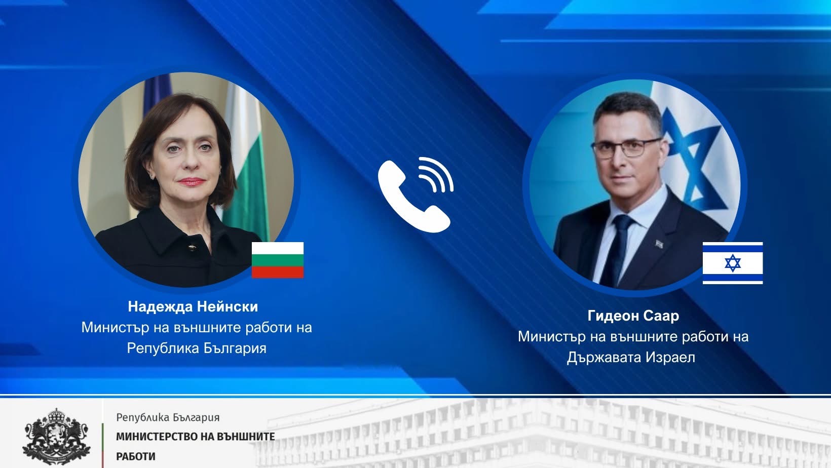 Министерката за надворешни работи на Р. Бугарија, Надежда Нејнски, оствари телефонски разговор со својот израелски колега Гидеон Саар, при што беше разгледана актуелната безбедносна и политичка состојба во регионот на Блискиот Исток.
