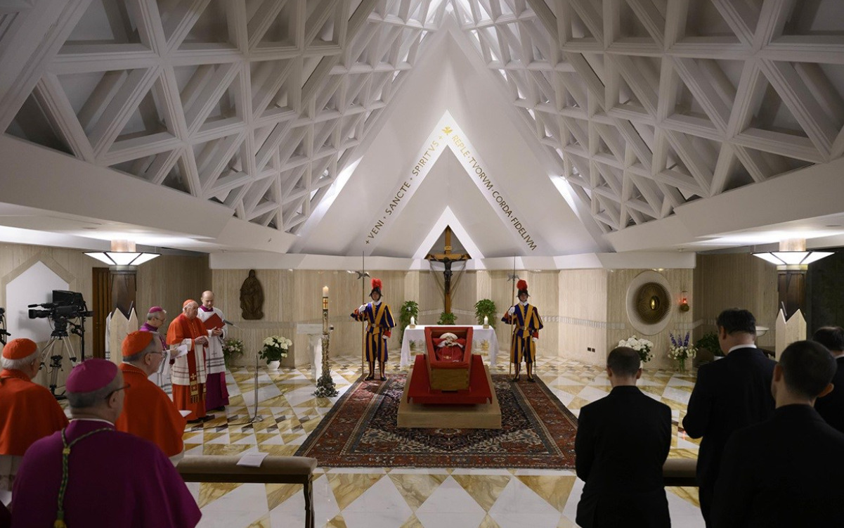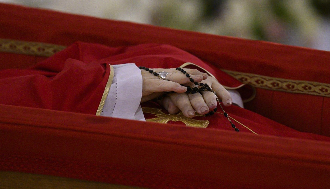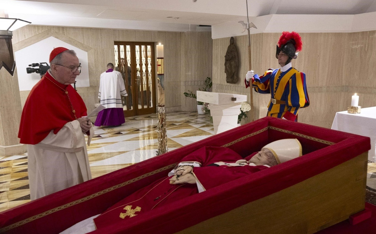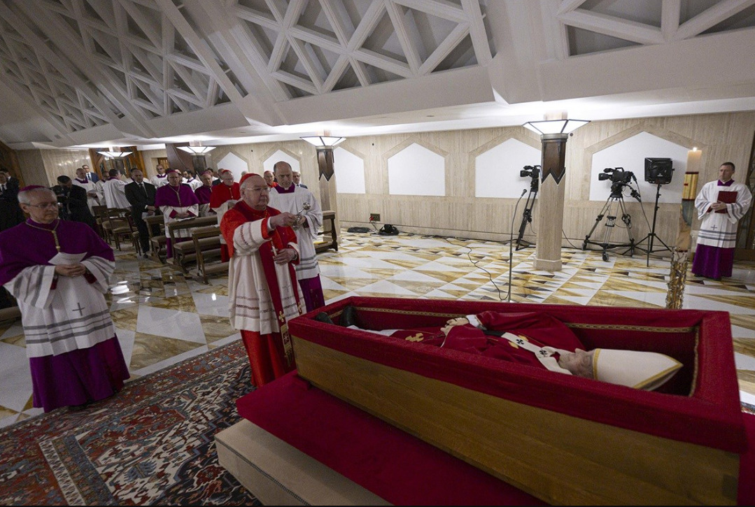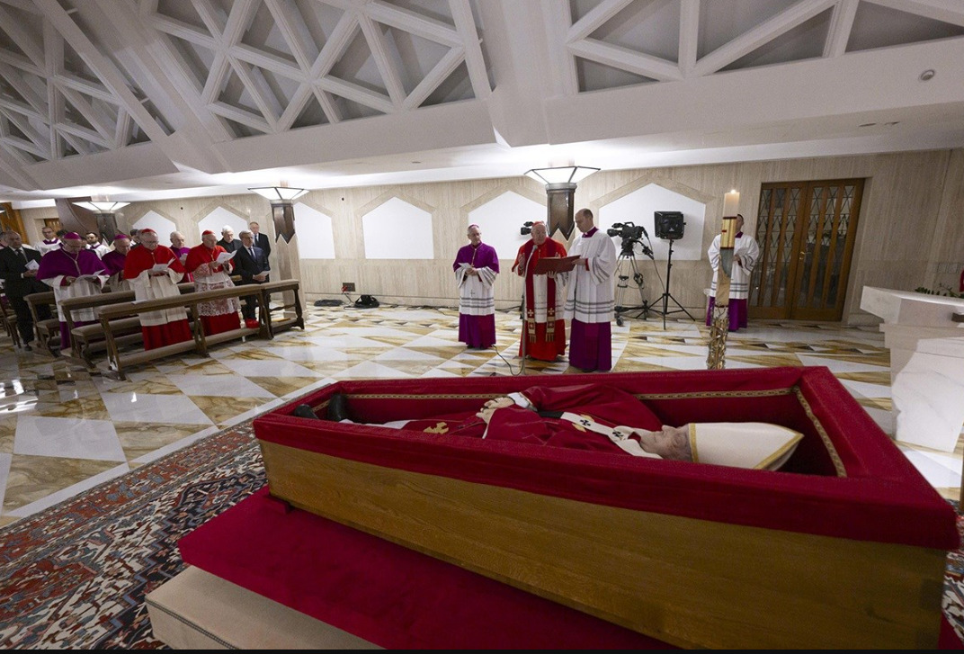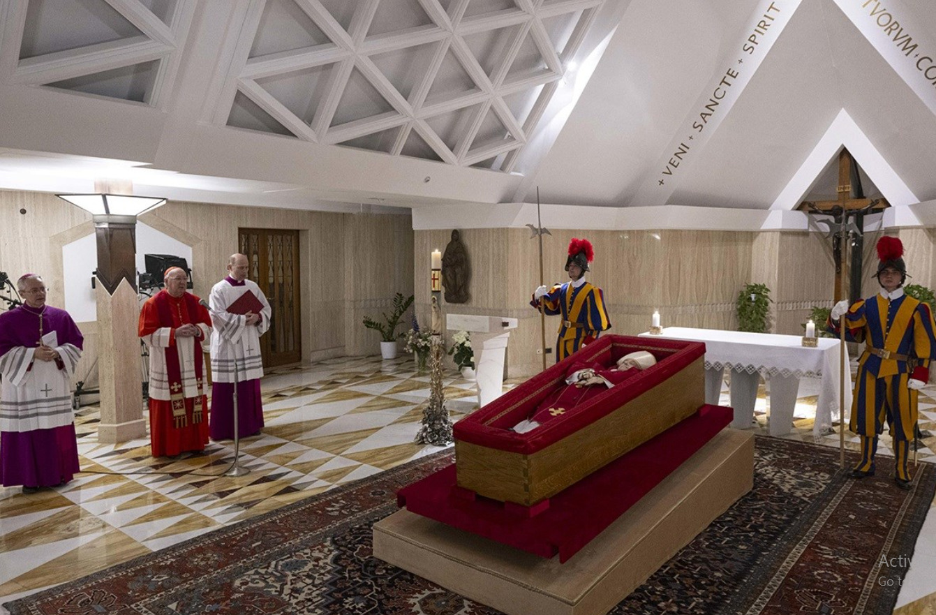 Телото на папата Франциско се уште се наоѓа во неговиот дом Санта Марта, каде што тој се опоравуваше откако помина повеќе од еден месец во римската болница Гемели поради билатерална пневмонија.