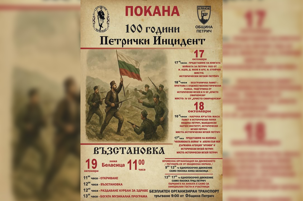 Општина Петрич и Историскиот музеј во градот подготвија серија од настани по повод 100-годишнината од Петричкиот инцидент од 1925 година. Одбележувањето ќе се одржи од 17 до 19 октомври 2025 година и ќе вклучи книжевни, научни и културни активности, изложби и историска реконструкција, јавува Пиринско.