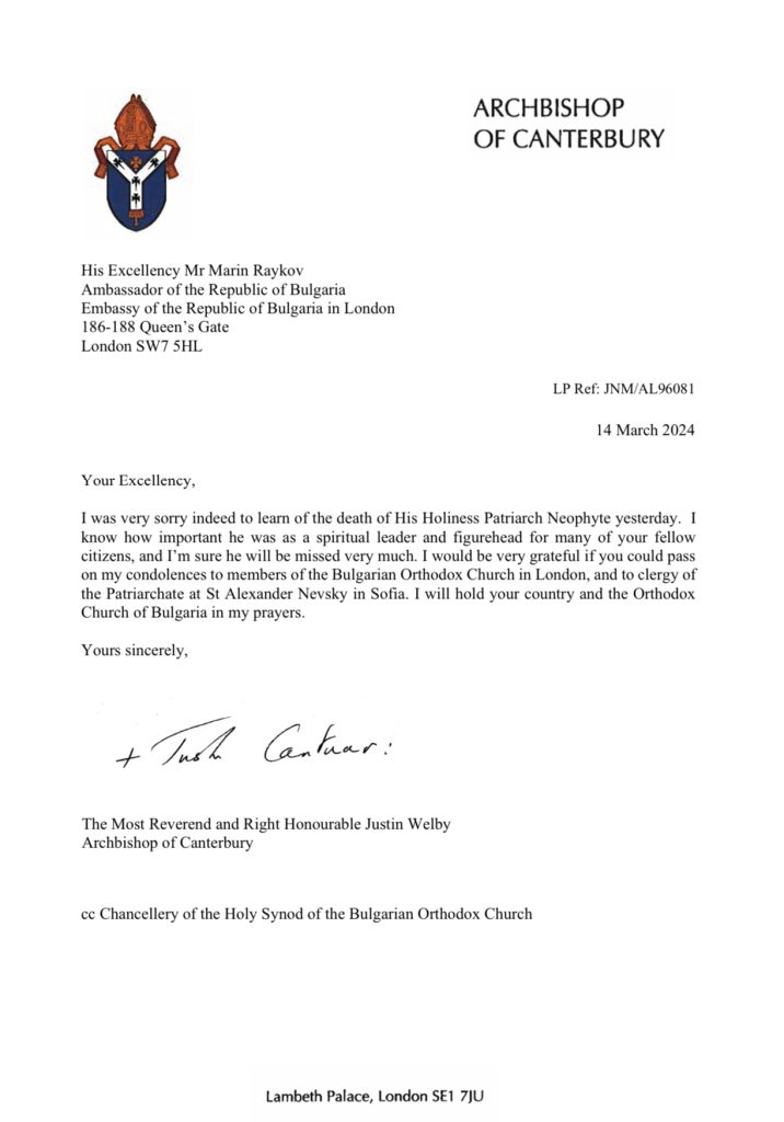 Архиепископот на Кантербери и поглавар на Aнгликанската црква, Неговата Светост Џастин Велби, испрати телеграма со сочувство до амбасадорот на Бугарија во Обединетото Кралство, неговата екселенција Маријан Рајков и до Светиот синод на Бугарската православна црква, поради кончината на бугарскиот патријарх Неофит.