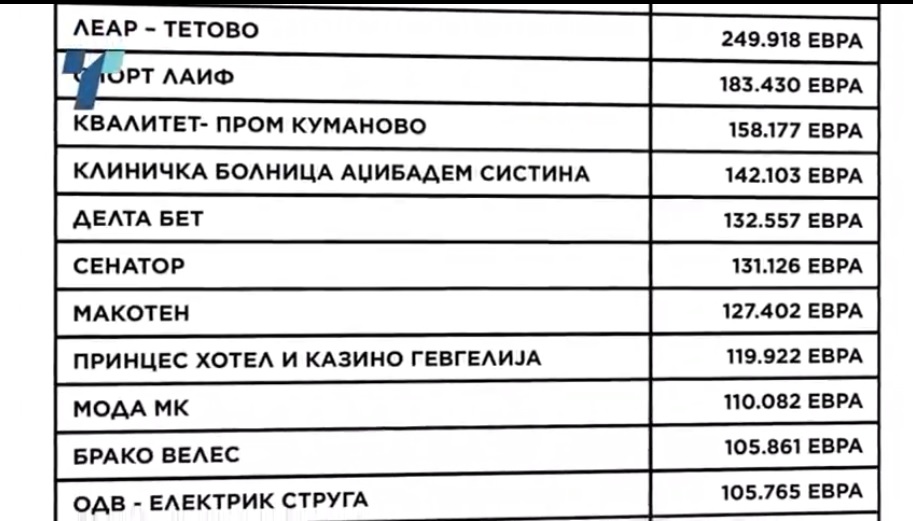 Пари добила и компанијата Пелистерка, винарската визба Тиквеш, голем дел медиуми, дури и компанијата Дурмо турс за која се води судски процес за несреќата кај Ласкарци. А на листата е и Исламската заедница – Муфтивство Прилеп кај која легнале над 32.000 евра.