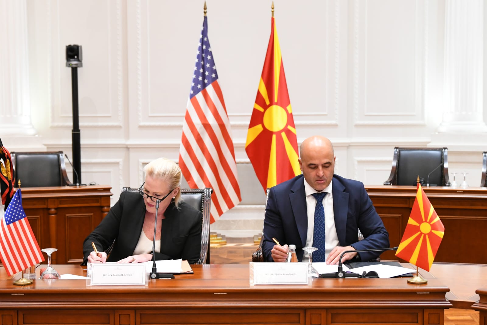 Претседателот на Владата на Република Северна Македонија, Димитар Ковачевски и амбасадорката на САД во земјава, Анџела П. Агелер, денеска, потпишаа Меморандум за разбирање меѓу Владите на Северна Македонија и на Соединетите Американски Држави за експертска поддршка за Владата на Република Северна Македонија во изработка на Национална стратегија за безбедност.