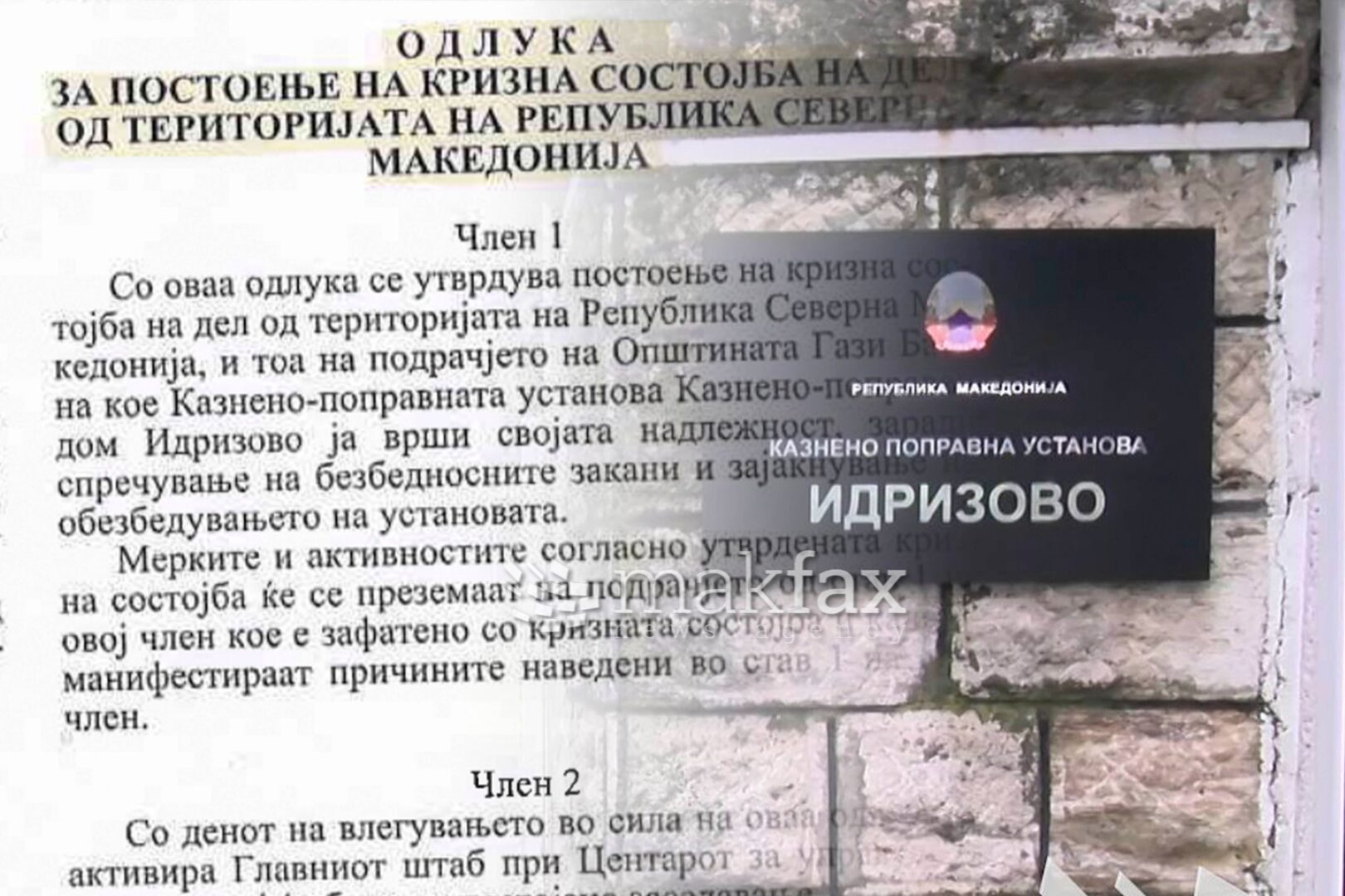 „Со оваа одлука се утврдува постоење кризна состојба на дел од територијата на Република Северна Македонија, и тоа на подрачјето на општината Гази Баба, на кое Казнено-поправната установа Казнено-поправен дом ‘Идризово’ ја врши својата надлежност поради спречување на безбедносните закани и зајакнување на обезбедувањето на установата“, гласи текстот на одлуката.