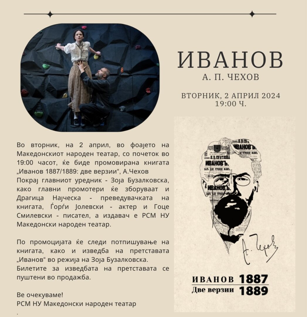 По промоцијата ќе следи потпишување на книгата, како и изведба на претставата „Иванов“ во режија на Зоја Бузалковска.