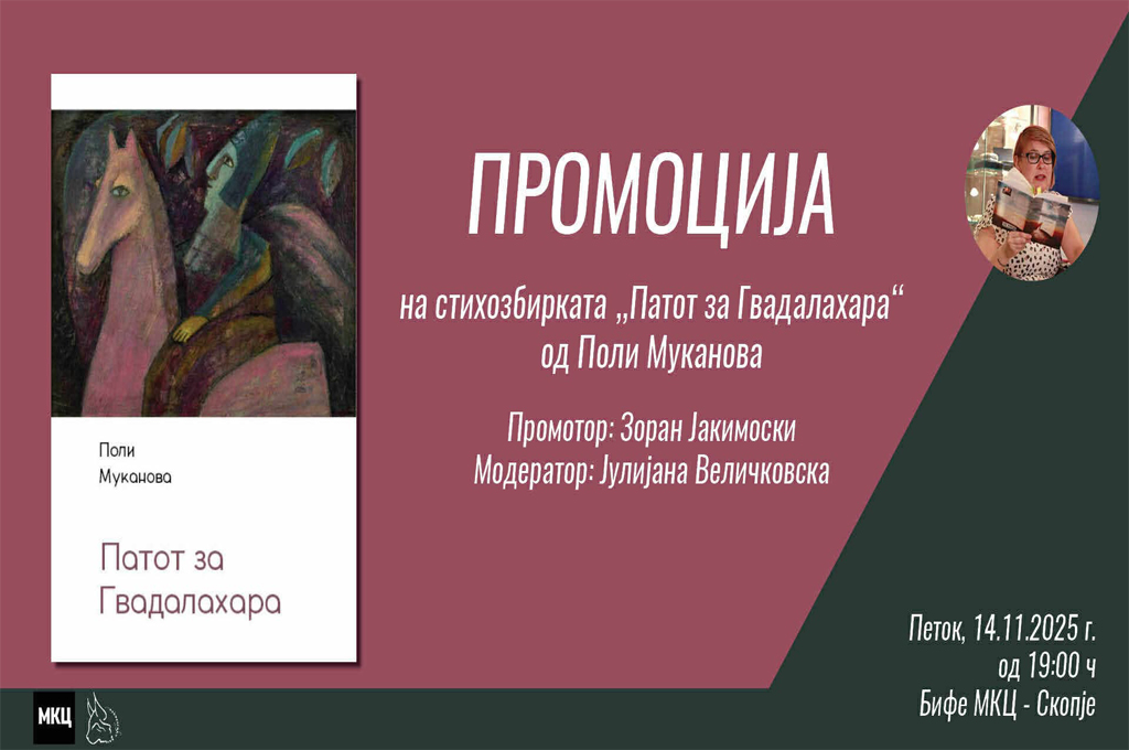 На 14 ноември, од 19:00 ч. во Младинскиот културен центар во Скопје ќе се одржи промоцијата на стихозбирката „Патот за Гвадалахара“ на бугарската поетеса Поли Муканова. Промотор на настанот е Зоран Јакимоски, а модератор е Јулијана Величковска, прв човек на издаваштвото ПНВ Публикации/PNV Publishing. Токму тоа е и издаваштвото, што стои позади стихозбирката на Муканова за домашниот пазар.