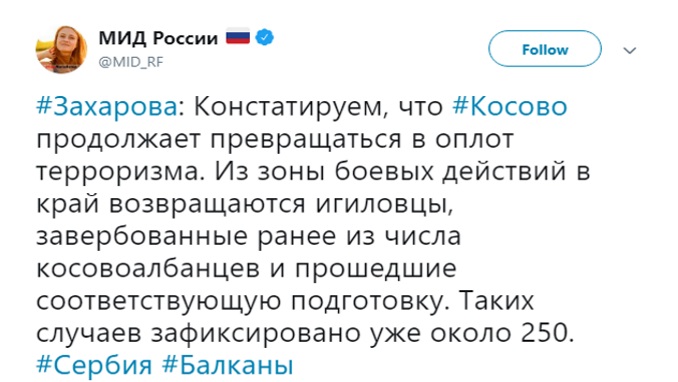 Таа додаде дека од зоната на борбени дејства во Косово се враќаат борците на ИД, кои претходно биле врбувани меѓу косовските Албанци и кои ја поминале потребната обука. Според Захарова, забележани се речиси 250 такви случаи.