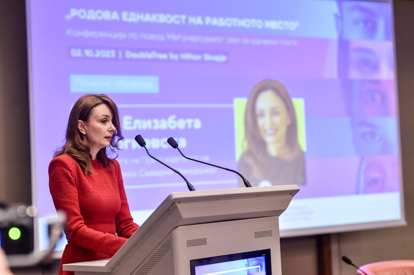 Свое поздравно обраќање имаше и г-а Елизабета Ѓоргиевска, Сопруга на Претседателот на Република Северна Македонија: „Сите човечки суштества се раѓаат слободни и еднакви по достоинство и права. Ова е првата реченица во првиот член на Универзалната декларација за човековите права, што беше усвоена пред 75 години. Фактите зборуваат дека и 75 години по усвојувањето на Декларацијата, родовиот јаз во платите сè уште постои, вклучително и кај нас исто така. И покрај тоа што жените стекнуваат квалитетно образование, сè уште жените се соочуваат со родово базирана дискриминација не само при вработувањето, туку и при кариерното унапредување и уште повеќе кон праведното вреднување на нивниот труд. Иронијата е што ефектите не ги чувствуваат само жените, туку и целата македонска економија. Нееднаквоста ги маргинализира и ги демотивира жените, а со тоа ја лишува економијата од нивниот креативен потенцијал.“