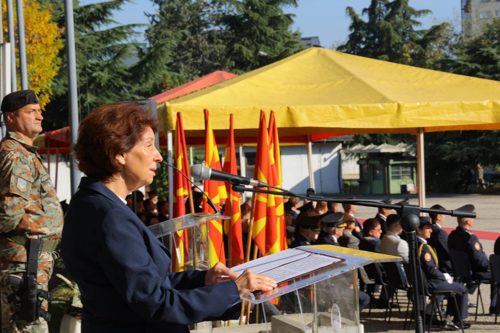 Во обраќањето пред питомците, претседателката Сиљановска Давкова посочи дека нашата армија е составена од професионални, мотивирани и кредибилни старешини и војници кои во изминативе пет години како дел од НАТО, но и како дел од Партнерството за мир и бројните мисии, покажаа и се уште покажуваат и докажуваат дека можат да стојат рамо до рамо со колегите од најсилните армии и да постигнуваат највисоки резултати, одлично вршејќи ги своите задачи.