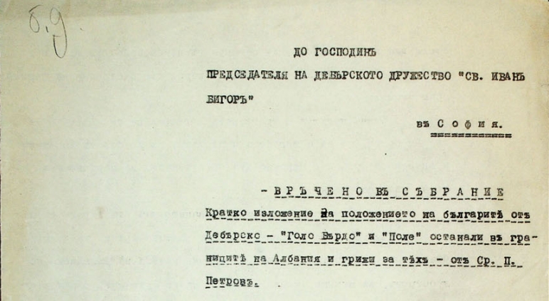 Извештај за состојбата на Бугарите од „Голо Брдо“ и „Поле“, што останале во границите на Албанија, испратен од Сребрен Поппетров до Дебарското друштво „Св. Иван Бигор“ во 1930 година.