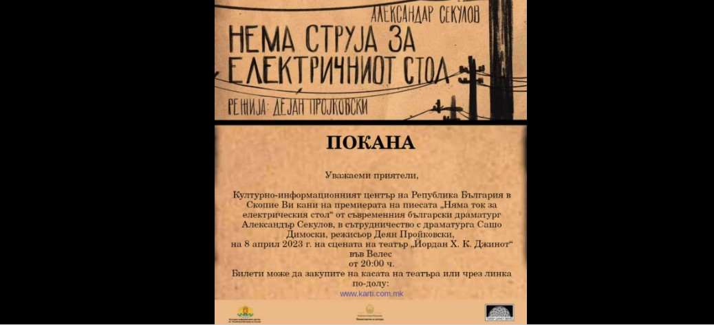 Во Драмскиот театар „Јордан Хаџиконстантинов-Џинот“ во Велес вечерва ќе биде претставена премиерата на претставата на бугарскиот драмски автор Александар Секулов „Нема струја за електричната столица“, која во 2016 година ја доби наградата за современа бугарска драма – „Аскеер“.