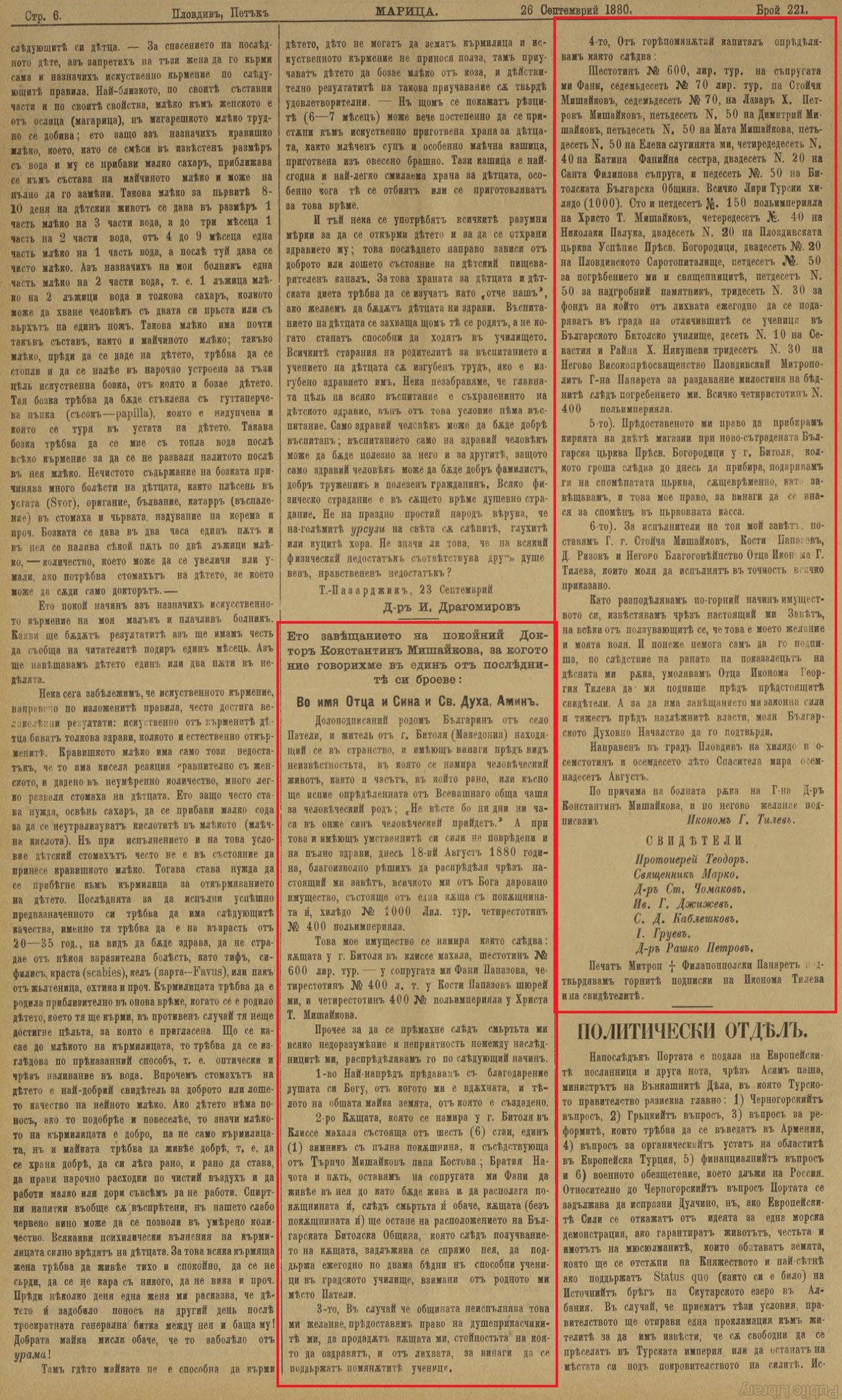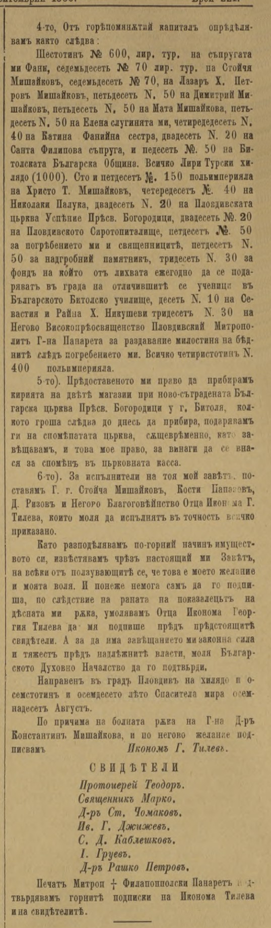 Сто и педесет (150) полиимпериали на Христо Т. Мишајков, четириесет (40) на Николаки Палука, дваесет (20) на Пловдивската црква успение на Пресвета Богоридица, дваесет (20) на Пловдивското сиропиталиште, педесет (50) за мојот погреб и за свештениците, педесет (50) за надгробниот споменик, триесет (30) за фондот, од чијашто камата секоја година да се подаруваат во градот на одличните ученици во БЪЛГАРСКОТО БИТОЛСКО УЧИЛИШТЕ, десет (10) на Севастија и Рајна х. Никушеви, триесет (30) на Неговото Високопреосвештенство Пловдивски Митрополит г-н Панарет за раздавање на милостина на сиромасите после мојот погреб. Вкупно четиристотини (400) полиимпериали.