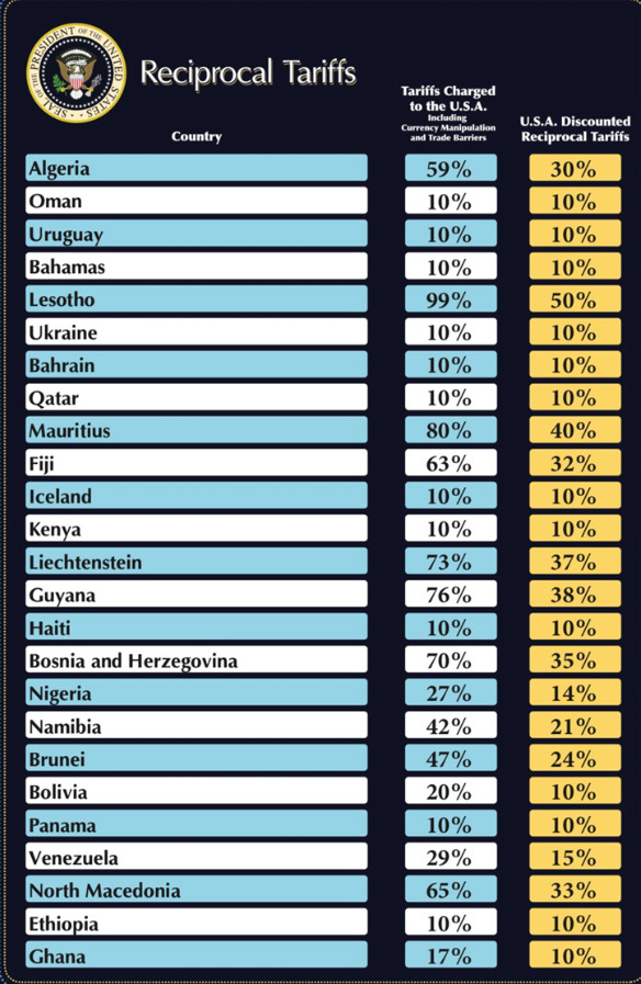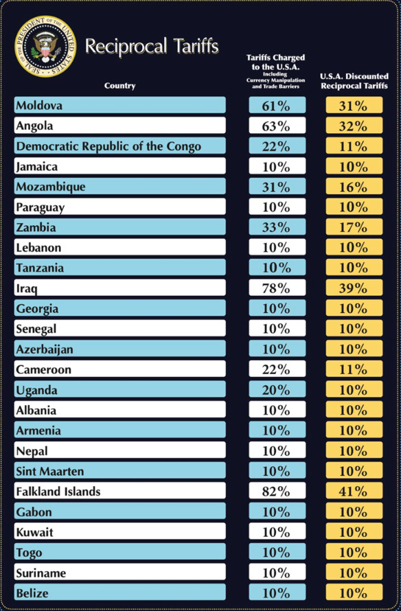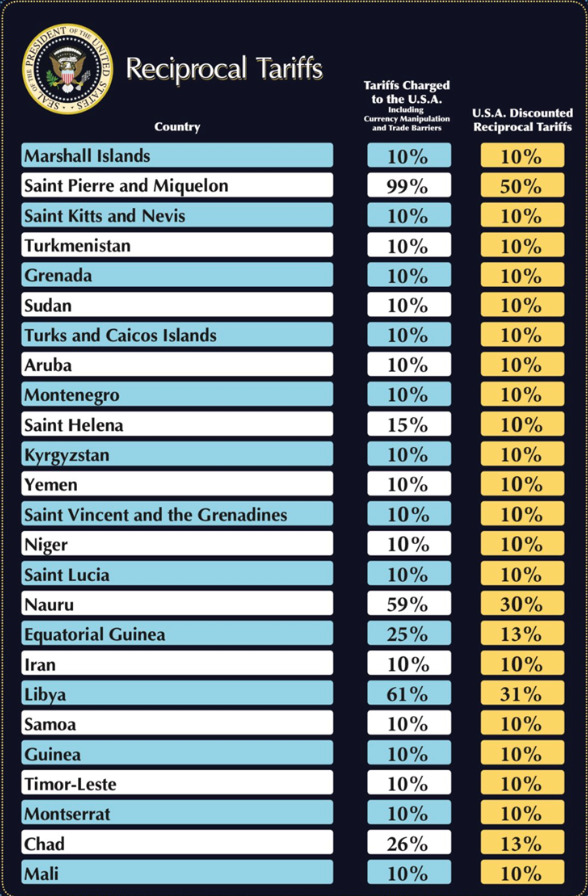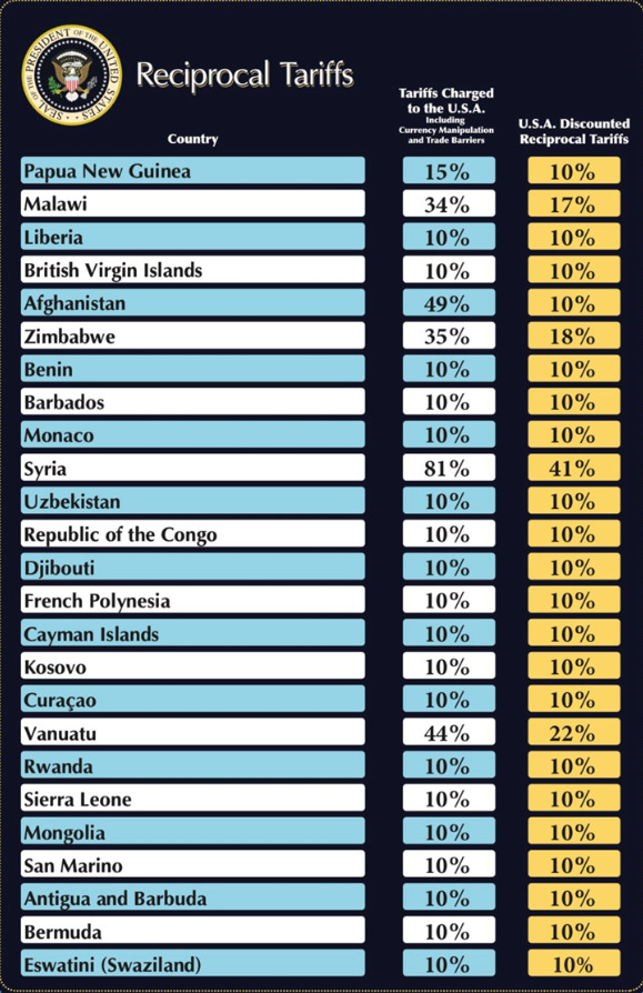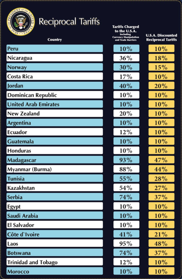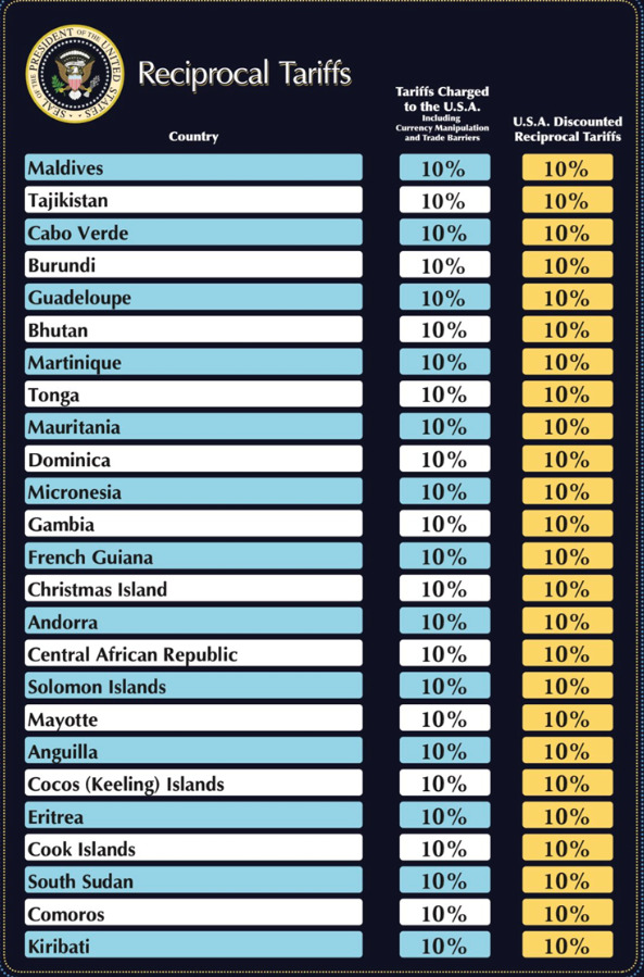 Трамп рече дека неговиот план ќе постави основна царина од 10 проценти, така што земјите и териториите кои имаат царини од 10 проценти за американските производи ќе имаат ист износ на царини.