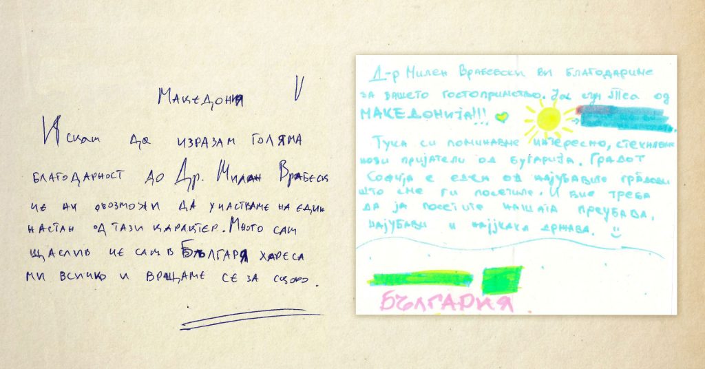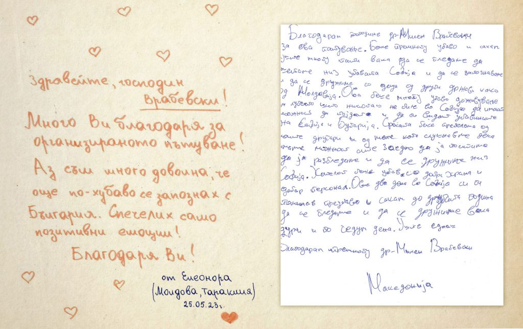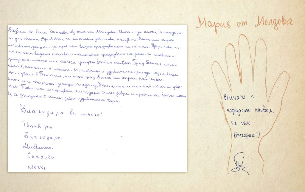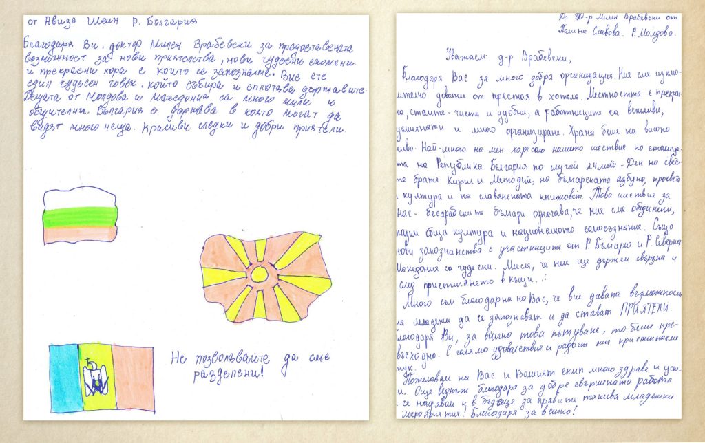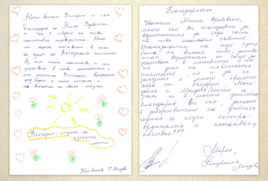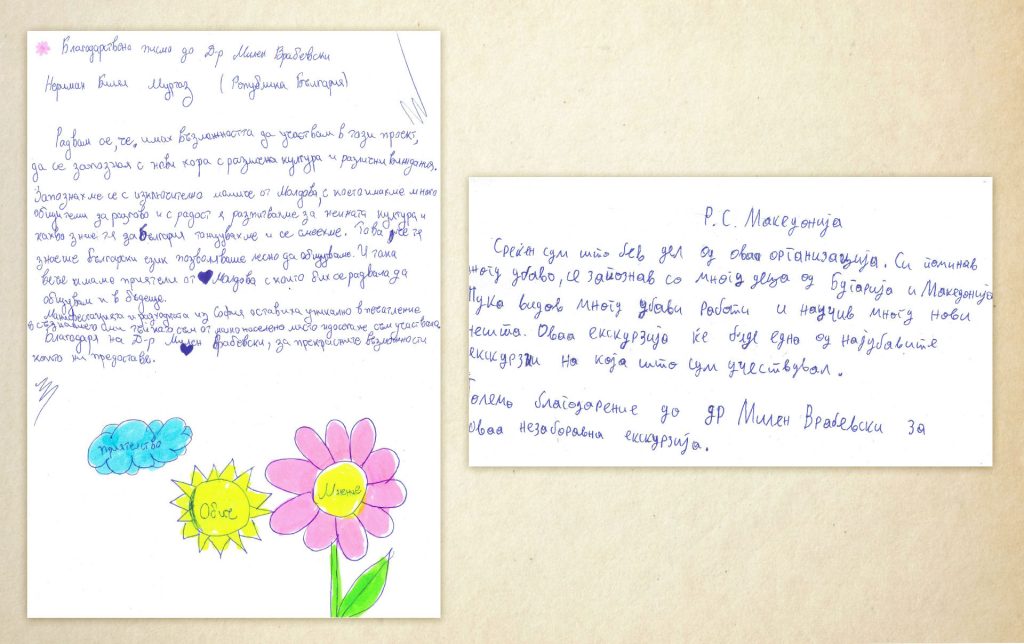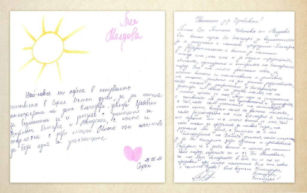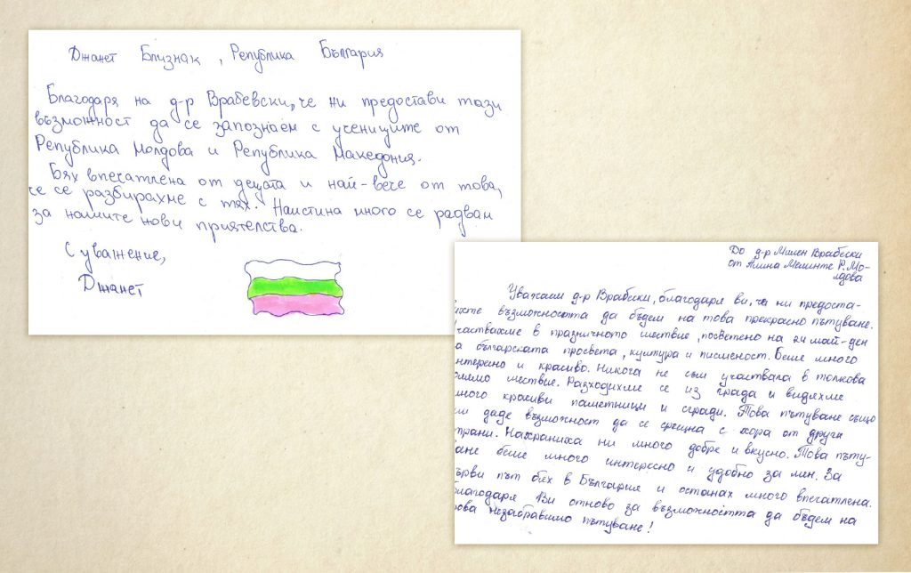 “Досега ја немав посетено Софија и мило ми е што имав можност да ја видам убавината на Бугарија и да се приклучам на поворката за 24 мај! Благодарам на д-р Врабевски што не покани и создаде толку многу пријателства”, вели во своето писмо ученичка од РС Македонија во писмо до д-р Врабевски.