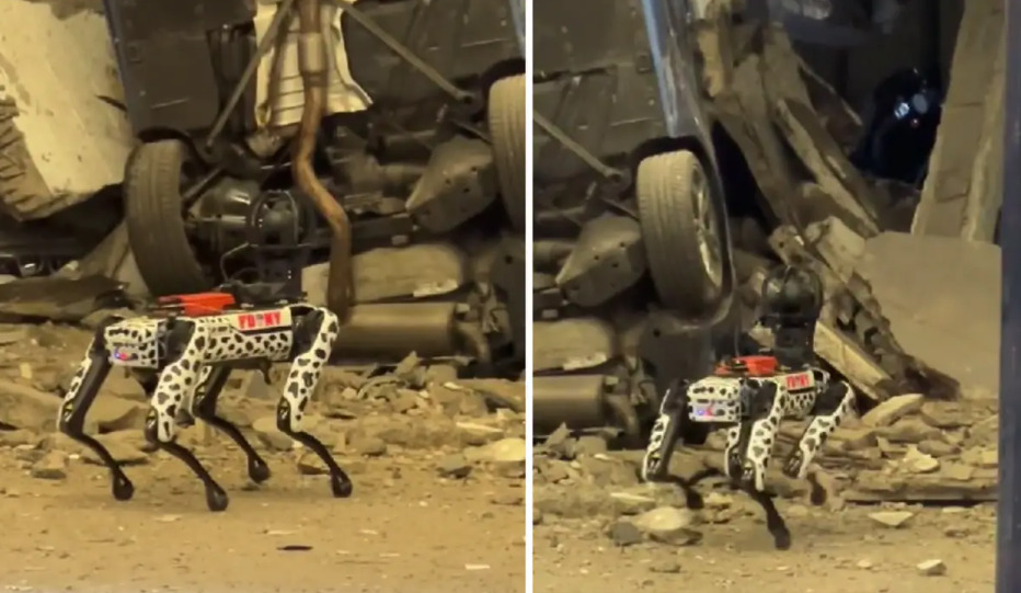 Куче-робот се движи меѓу урнатините од катната гаража во Њујорк, со цел да пронајде преживеани, но и да го процени уништувањето во кое загина еден работник и повреди пет лица.