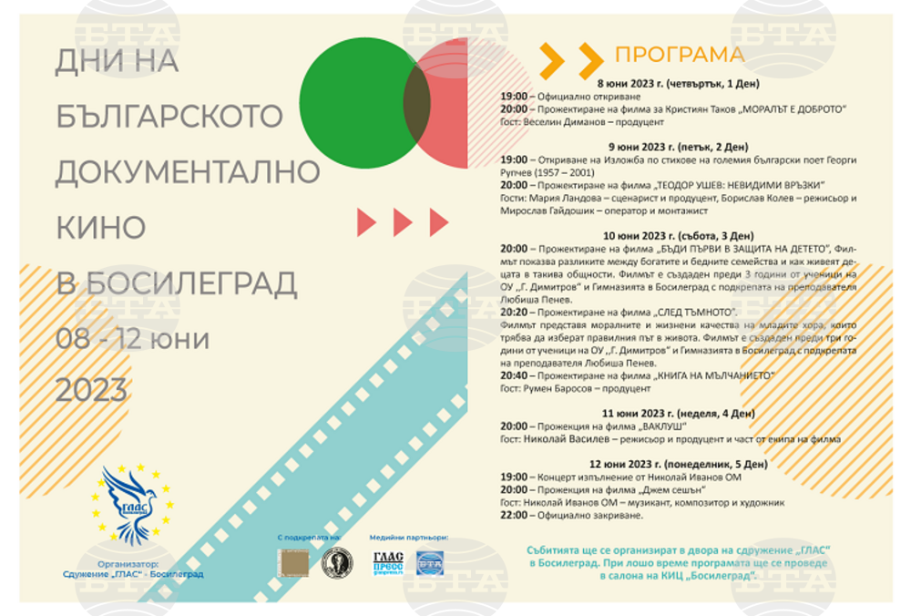 Во сабота жителите и гостите на Босилеград ќе можат да погледнат два кратки филмови снимени пред три години од деца од Босилеград, предводени од нивниот учител Љубиша Пенев. На програмата е и проекција на филмот „Книга на тишината“, кој се очекува да го претстави продуцентот Румен Баросов.