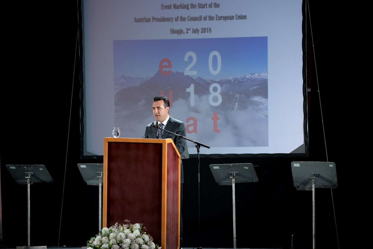 Пред присутните, амбасадорката на Република Австрија во Република Македонија, Ренате Коблер, амбасадорот на ЕУ во Македонија, Самуел Жбогар, амбасадорот на Република Бугарија во Република Македонија, Иван Петков, претставници од дипломатскиот кор во земјава, од Владата, од Парламентот, претставници од други институции и организации, граѓани, премиерот Заев упати честитки за почетокот на претседавањето на Република Австрија со Европската унија, се заблагодари за големата поддршка од Австрија за почеток на пристапните преговори на Македонија со ЕУ и ги соопшти очекувањата на граѓаните на нашата држава и на Владата на Република Македонија.
